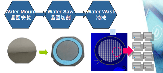 通過Saw Blade將整片Wafer切割成一個個獨立的Dice,方便后面的 Die Attach等工序;
