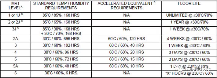 注:對于6級,元件使用之前必須經(jīng)過烘焙,并且必須在潮濕敏感注意標貼上所規(guī)定的時間限定內(nèi)回流。
