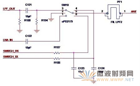 如圖5-3所示,就是Atheros的典型發(fā)射與接收回路SW10就是那顆切換芯片。LPF_OUT是來自功率放大器的輸出信號(hào),R186,C121與R194組成了Π型匹配網(wǎng)絡(luò),LNA_IN是送至低噪聲放大器的信號(hào),SWITCH_TX與SWICTH_RX這兩個(gè)信號(hào)的組合就控制著是打開發(fā)射通路還是打開接收通路。