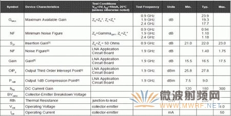微波器件(晶體管或芯片)的參數(shù),基本上就決定了低噪聲放大器的性能,我們來看一下最常用的SGA-8343的參數(shù),如圖4-2所示。圖中給出的參數(shù)包括最大增益,噪聲系數(shù),S21,工作頻率,供電電壓,消耗的電流等等。對(duì)于專用的低噪聲放大器芯片,參數(shù)也基本如此,在這里我們就不詳細(xì)說了。