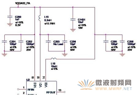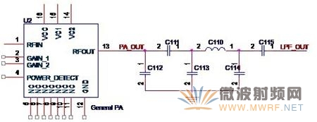 這時(shí),我們就可以把功放芯片的輸出端與低通濾波器相連接,就得到了一般射頻功率放大電路的完整的輸出回路,如圖3-8所示。