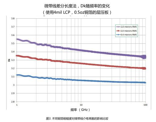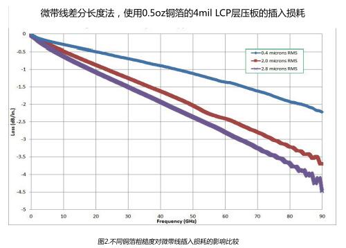 在波導中,導體的表面粗糙度對導體損耗有著顯著的影響,這一點在微波工程的早期就已經(jīng)被人們所熟知。1949年,S.P.Morgan(參考文獻1)發(fā)表的數(shù)值模擬結(jié)果表明導體表面粗糙度可導致導體損耗成倍增加。 Hammerstad和 Jensen(參考文獻2)將 Morgan的模型和數(shù)據(jù)與微帶設計方法結(jié)合起來。Hαυ的模型成為計算表面粗糙度對導體損耗影響的“教科書″(參考文獻3)式的方法。隨著使用更髙頻率和更薄層壓板,硏究發(fā)現(xiàn)Hα模型明顯低估了表面粗糙度對導體損耗的影響(參考文獻5,6)Hal- Huray"模型(參考文獻4)是從“第一原則”分析發(fā)展而來,最近已經(jīng)被商業(yè)仿真設計軟件采用。根據(jù)我們的經(jīng)驗,通過適當調(diào)整輸入?yún)?shù),“Ha‖l- Huray”模型可以更準確預測不同層壓板厚度和頻率范圍內(nèi)的導體損耗?!?/span>Hal- Huray”模型已被納入羅杰斯公司的阻抗和損耗計算器軟件(MwM)中。我們目前正致力于開發(fā)最好的“HalHuray”輸入?yún)?shù)來模擬羅杰斯的層壓板性能。請在線査看羅杰斯官網(wǎng)的攴持中心或聯(lián)系您所在地區(qū)的羅杰斯銷售工程師來獲取最新信息。羅杰斯對銅箔的硏究(參考文獻5,6,7)還表眀,銅箔粗糙度會影響傳播常數(shù),比較粗糙的銅箔表面會導致有效介電常數(shù)明顯增加。圖3顯示了在4mi液晶聚合物層壓板(LCP)上,分別使用Sq值在0.4um到28um的銅箔,其50歐姆傳輸線的介電常數(shù)情況??梢钥吹骄哂凶畲蟠植诙茹~箔的電路的Dk增加近10‰%。在“ Hall-huray"模型中沒有考慮到銅箔粗糙程度對相位響應的影響銅箔表面粗糙度對插入損耗的影響非常明顯(如圖2)。在90GHz下,由4mi厚的液晶聚合物(LCP)層壓板、壓延銅箔(藍線)制成的50歐姆傳輸線的插入損耗汋2.2dB/iηch,該性能幾乎與完全光滑的銅箈導體的模型完全相同。在相同的基板上采用標準電解銅箔,其Sq值為2.oum,插入損耗增大為3.7dB/inch。圖4顯示了圖2中所示數(shù)據(jù)的導體的銅箔表面粗糙度的形態(tài)。